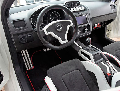 Каждый водитель современного GTI почувствует себя как дома сразу после посадки в салон. Спортивные сиденья ковшового типа нового дизайна обиты кожей Alcantara. Три круглых шкалы в центре приборной панели также напоминают об оригинальном GTI. Помимо этого, от гоночного автомобиля позаимствованы прозрачные откидные колпачки тумблеров важных функций, например отключения электронной системы обеспечения курсовой устойчивости. Во избежание случайного переключения тумблера сначала необходимо откинуть указательным пальцем колпачок, а затем переключить тумблер. Еще одно сходство — встроенный огнетушитель вместо перчаточного ящика. Для уменьшения массы обивка дверей практически полностью отсутствует; установлены только щитки, причем они намеренно открывают обзор работающих дверных механизмов.