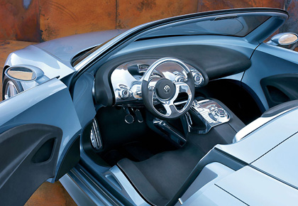 Еще одним новшеством являются сами приборы. Здесь информация также представляется в цифровом виде (частично с использованием аналоговых индикаций), и здесь при дальнейшем развитии проекта предполагается применение современных электролюминесцентных дисплеев по технологии OLED. При разработке этого концепт-кара в центре внимания находилась задача заново интерпретировать форму и функциональность и добиться их идеальной согласованности. Еще пример — главный прибор, или, точнее, главный функциональный уровень: после включения зажигания (без применения ключа, а только легким прикосновением к стартовому выключателю) он плавно перемещается справа в центр кабины. На этом центральном дисплее расположены такие классические функции управления, как скорость и температура двигателя.