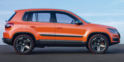 И это далеко не все, что можно сказать о силуэте концепта Tiguan. Здесь также в формах доминируют четкость и сила, и здесь также отсутствуют элементы, случайные по своему внешнему виду или не продуманные до мельчайших деталей. Если смотреть на автомобиль сбоку, то, за исключением небольших эмблем VW на 19-дюймовых колесных дисках, нельзя увидеть ни одного элемента, указывающего на принадлежность концепта Tiguan к семейству Volkswagen. И тем не менее, с первого же взгляда становится очевидным, что это все-таки Volkswagen, и именно отсюда можно сразу же понять, что перед вами находится родной брат Touareg. Не вызывает сомнений, это этот SUV имеет европейское, немецкое происхождение. Четкость и мощность прослеживаются в характерных колесных арках, в восходящей сзади линии остекления, в поверхностях дверей и крыльев, снова ставших трехмерными — и достаточно сильно выгнутыми — а также в безупречном дизайне задних стоек.