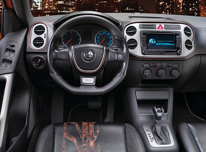 Для оформления салона прототипа выбраны черный, серебристый и оранжевый цвета. Черный цвет присутствует в кожаной обивке сидений, в приборах, некоторые из которых также отделаны кожей в классическом стиле, в отделке дверей и в обтянутом кожей рулевом колесе. Серебристый: сами приборы и ручки дверей, внутренние и наружные. Оранжевый: все швы на коже и рисунок оранжевой полосы на шинах, повторенный в средней части обивки сидений. Причина, по которой в салоне концепта Tiguan, несмотря на темные тона отделки, присутствует атмосфера дружелюбия, заключается не только в дизайне интерьера, но и прозрачной панорамной крыше длиной 1,34 метра и шириной 0,85 метра.